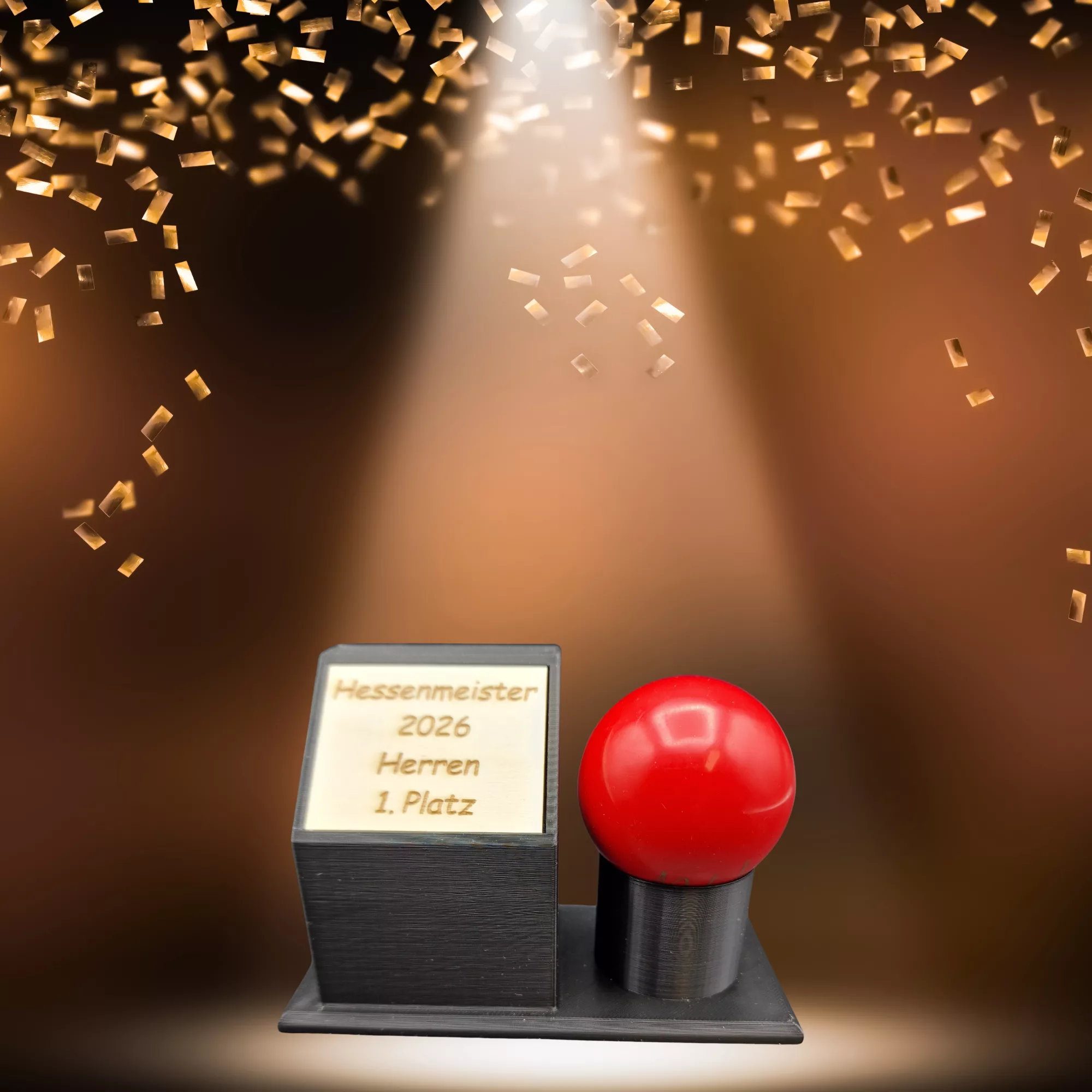 Ein hochwertiger Sockel mit individuell graviertem Holzplättchen trifft auf eine stilvoll platzierte Snookerkugel – minimalistisch, elegant und einzigartig.